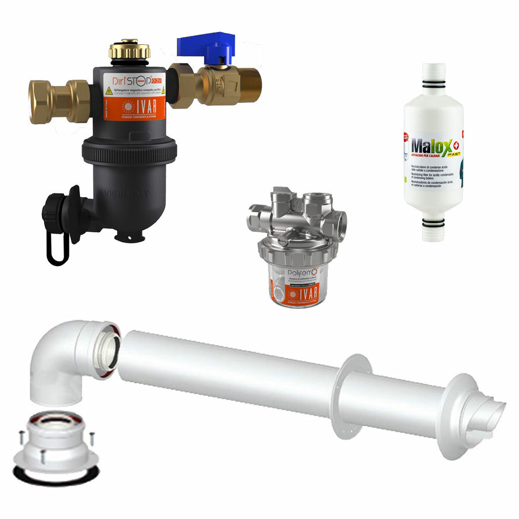 Kit d'installation pour chaudière à condensation Bosch composé d'un séparateur de boues magnétique, d'un distributeur de polyphosphate, d'un neutraliseur de condensats, d'un échappement de fumées coaxial diamètre 60/100 mm en aluminium et PP.